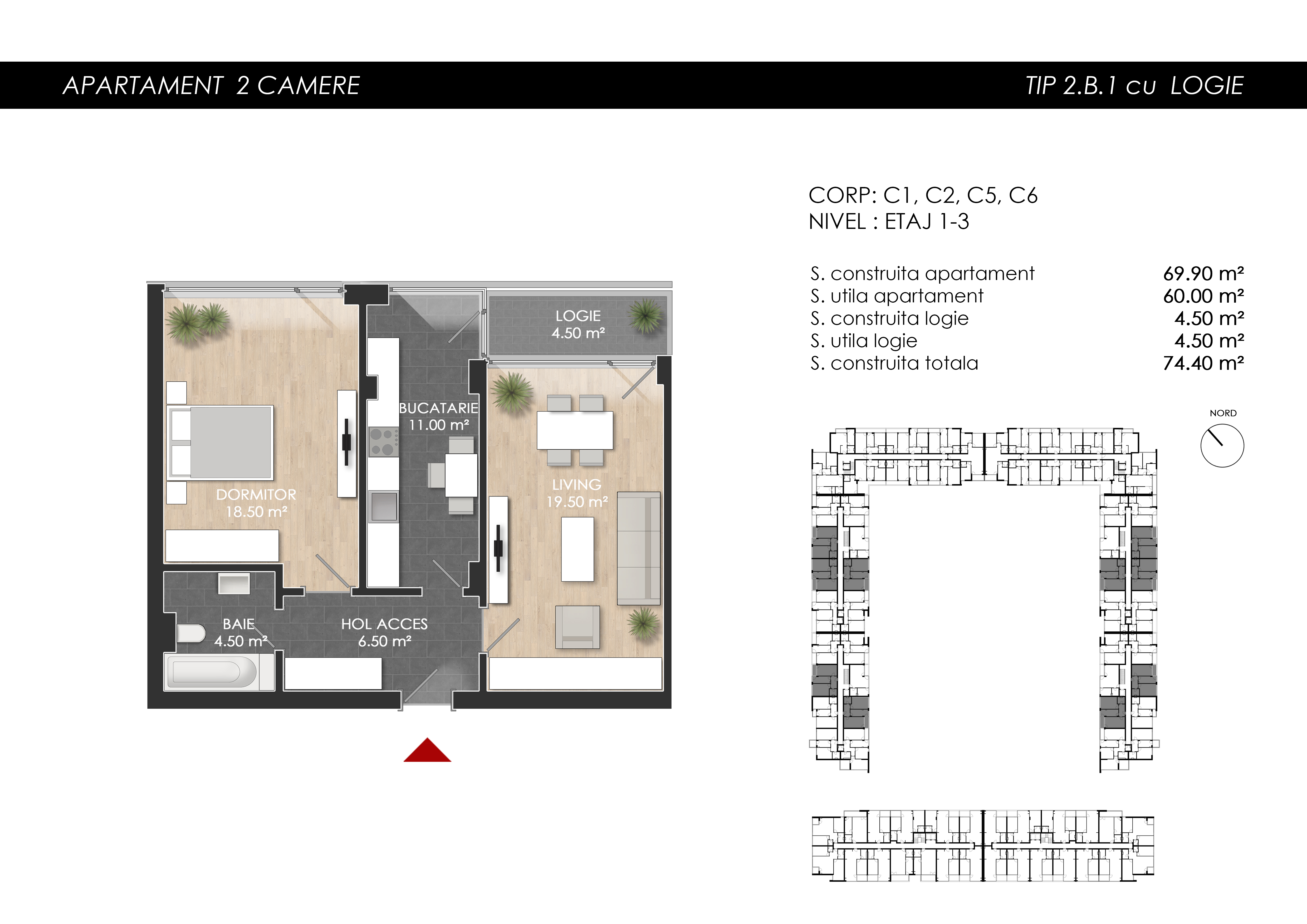 Apartament 2 camere tip 2B1 balcon | Etaj 1-3 | Corp C1, C2, C5, C6 | Faza 2