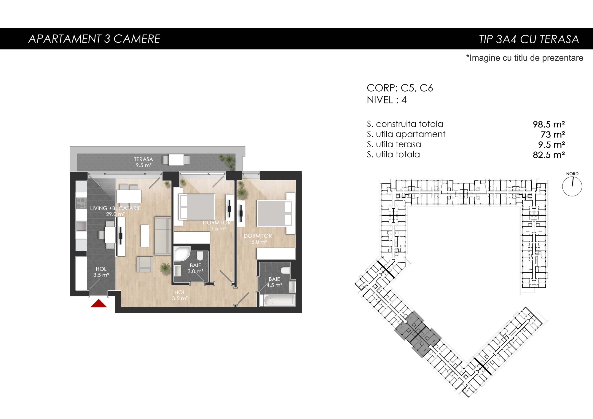 Apartament 3 camere tip 3A4 | Terasa | Etaj 4 | Corp C5, C6 | Faza 3