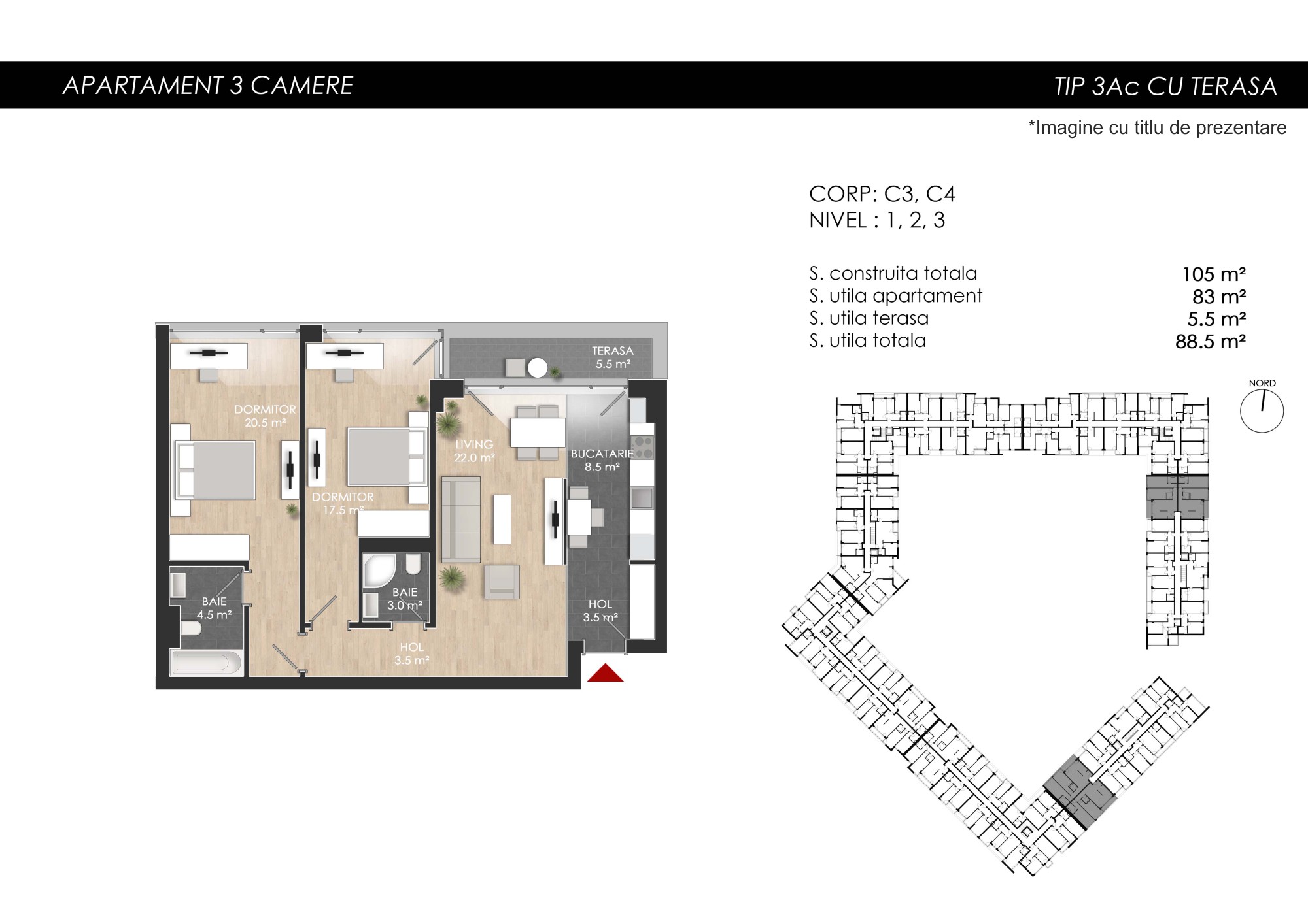 Apartament 3 camere tip 3Ac | Balcon | Etaj 1-3 | Corp C3, C4 | Faza 3