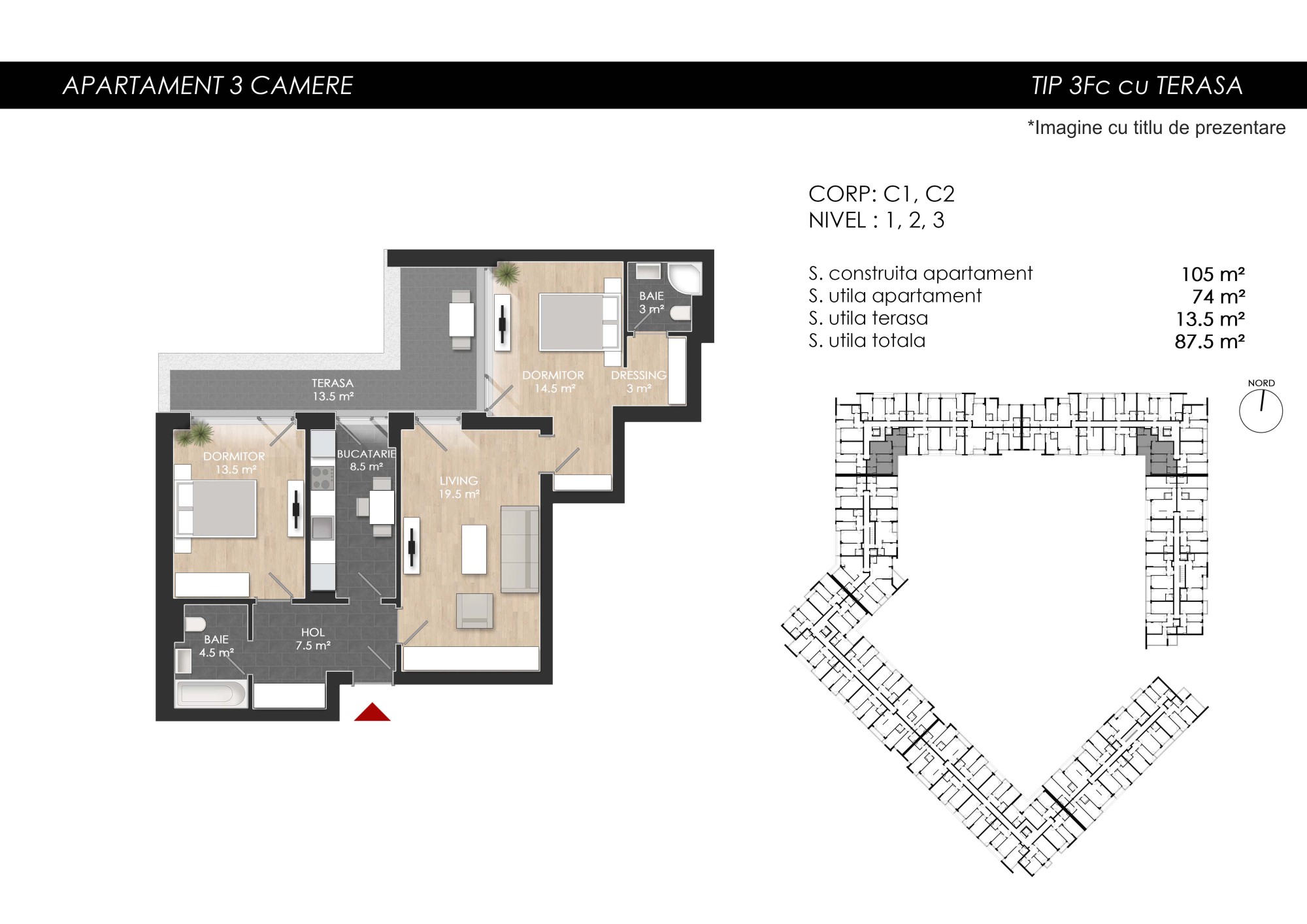 Apartament 3 camere tip 3Fc | Terasa | Etaj 1-3 | Corp C1, C2 | Faza 3
