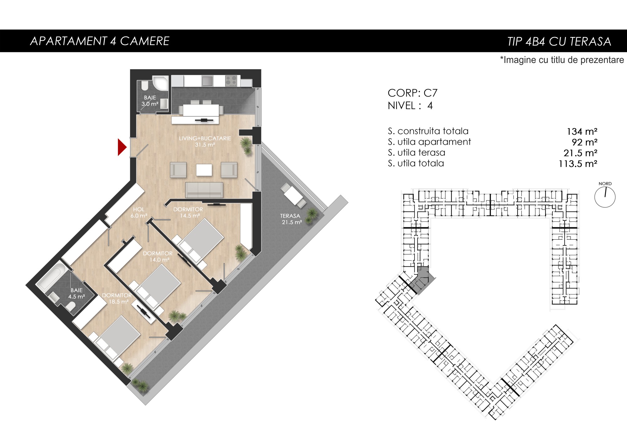 Apartament 4 camere tip 4B4Clona | Terasa | Etaj 4 | Corp C7 | Faza 3