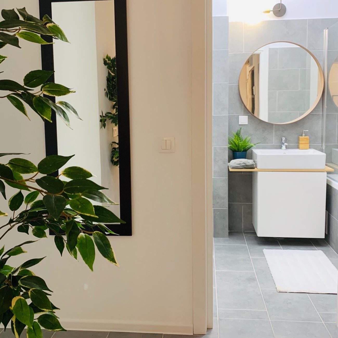 Pardoseala în băi și pe hol este din gresie KAI de calitate superioară, culoare neutră.